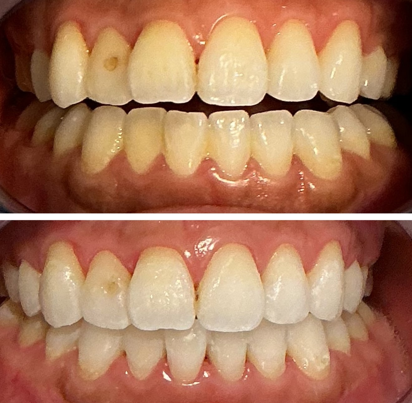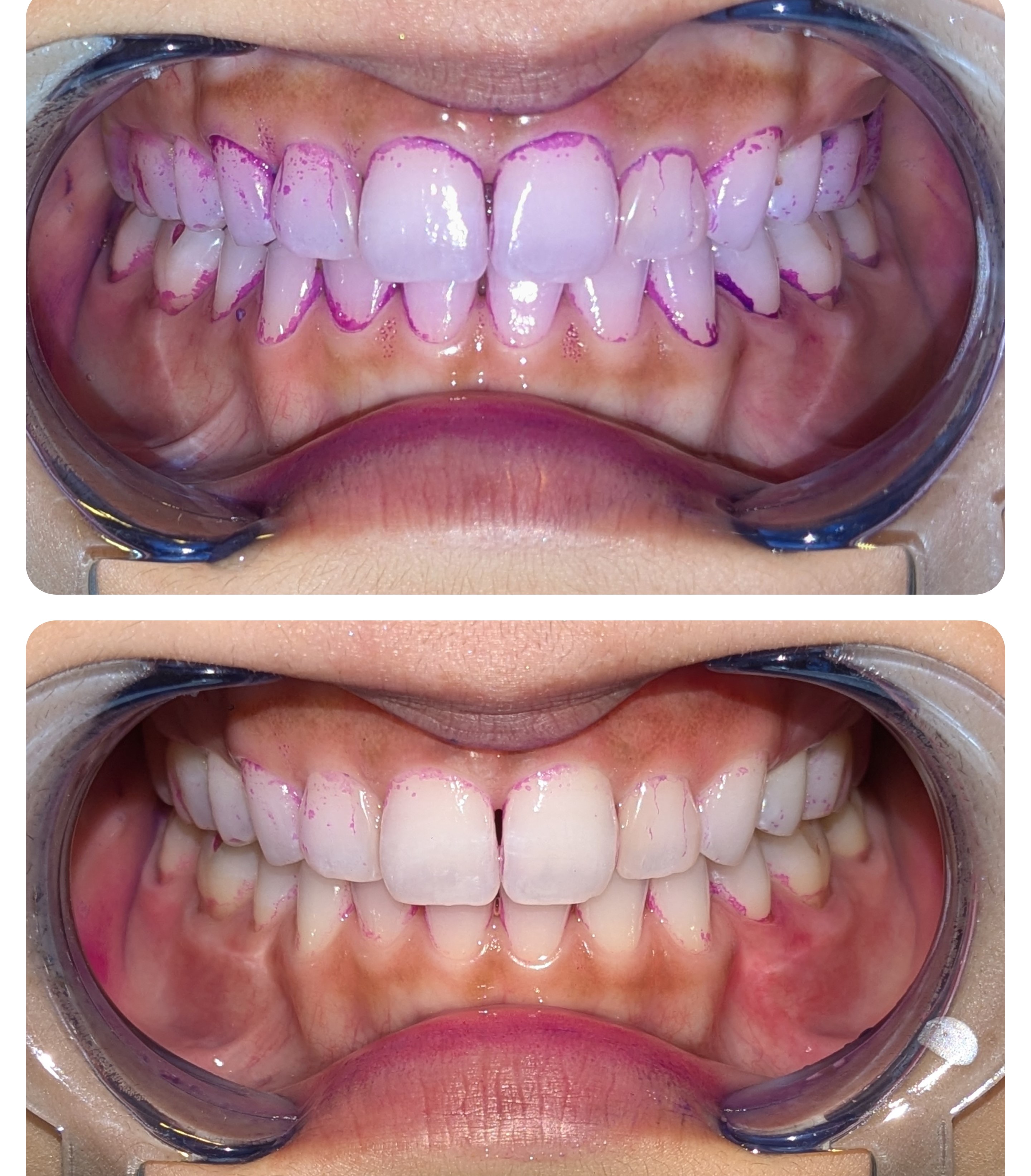 写真のようなしろっぽいネバっとした汚れがついていませんか?これがプラーク=細菌の塊です。歯と歯ぐきのあいだに歯ブラシをあてて、夜寝る前の歯磨きはフロスを含めて5~10分程度で丁寧に行いましょう。プラークが分からない方は染めだし液を週に1回程度使うとセルフチェックができます。子どものときや歯科医院にいったときに使うイメージがあるかもしれませんが、ご自宅でも使用できます。レトルトパウチに入った綿棒タイプがおすすめです。