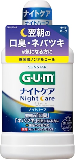 仕上げにうがい薬を使うと粘膜に付着した細菌まで殺菌することができます。ガム・ナイトケアリンスはノンアルコールで浮遊細菌を殺菌できるCPC(塩化セチルピリジウム)を配合、歯の表面のコーティング効果でプラークがつきにくくなります。
